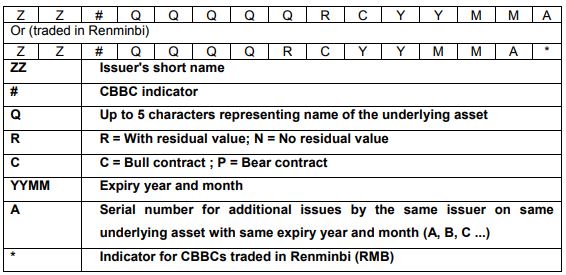 You should note that the above naming conventions are applicable in most cases but not exclusive for all circumstances. The stock short names of CBBCs indicate some basic information only. You should refer to the relevant listing documents of the product and consult your brokers or investment advisers before trading. Listing documents can be found at “Securities Products” under the "Products & Services" section of the HKEX’s website